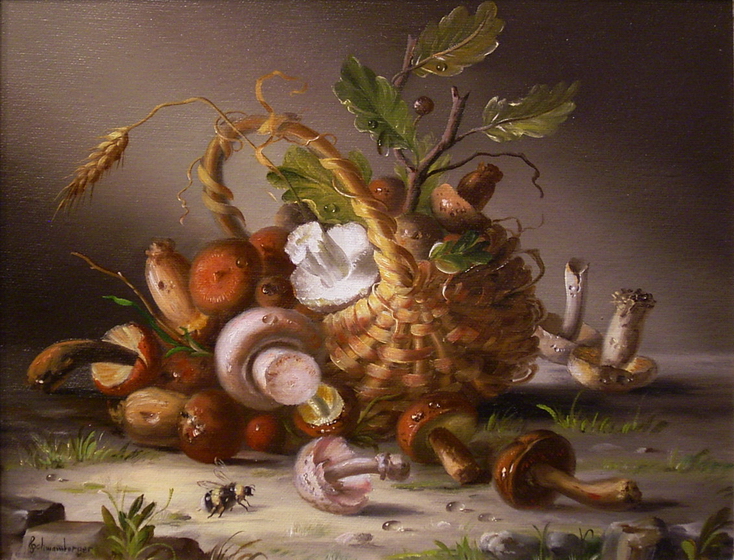 “Stilleben mit Pilzen und Korb”24 x 30 cm, Öl-Leinwand, l. u. signiert