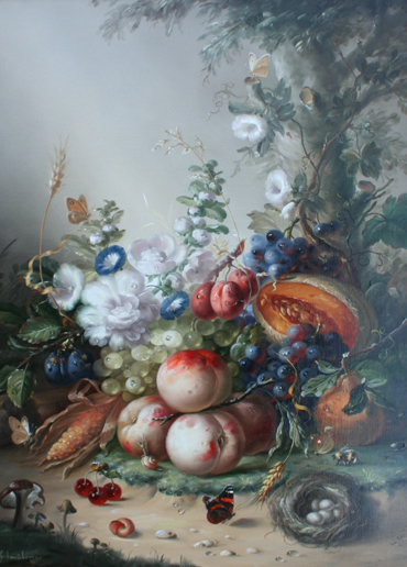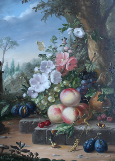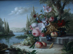 Blumen und Früchte vor Landschaft 30x24cm, Öl-Holz, l.u.signiert