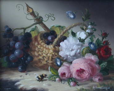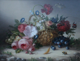 Blumenstilleben mit Korb und Früchten" Öl-Holz, 18x24cm, l.u. signiert